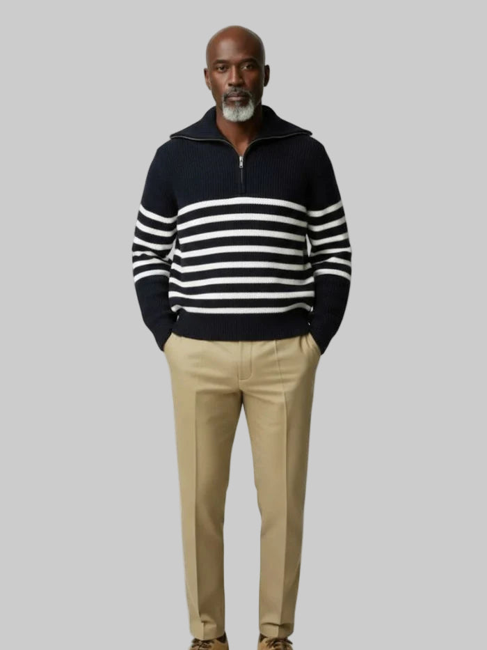 Die Marina Striped Zip Pullover ist ein zeitloser, maritimer Klassiker – perfekt für Männer, die Stil, Komfort und Qualität schätzen.