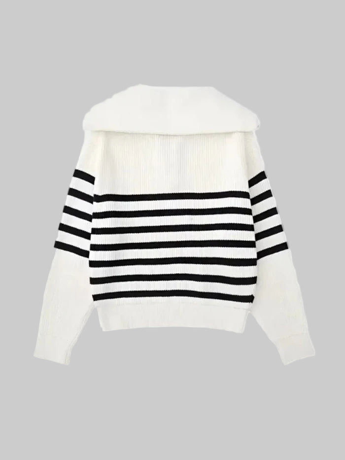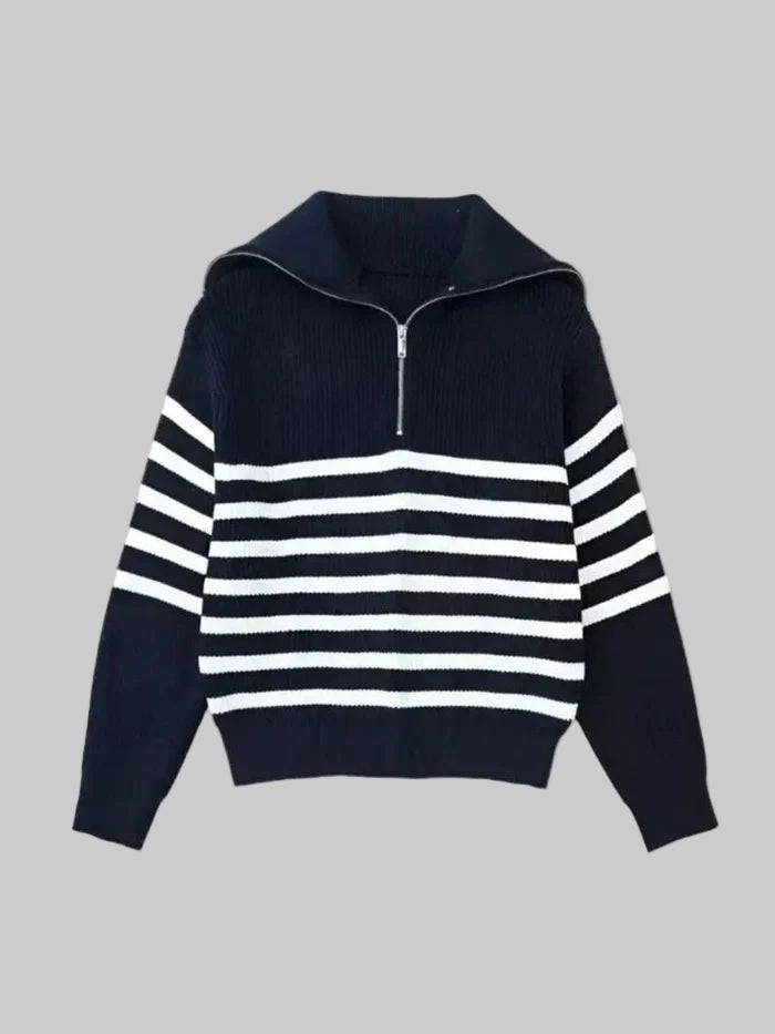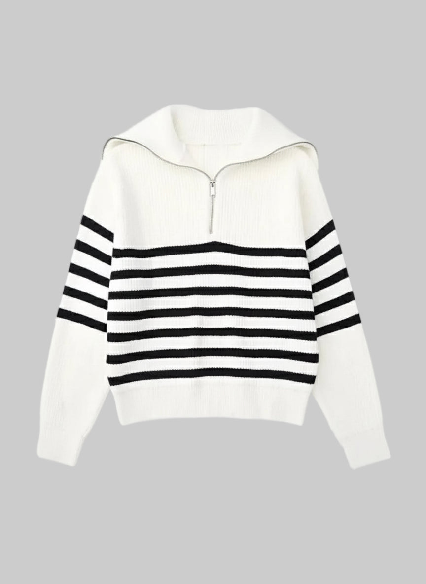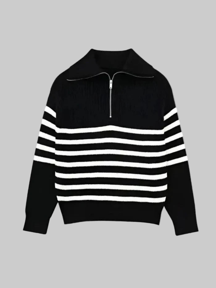 Der halbe Reißverschluss und der elegante Umlegekragen verleihen dem Pullover eine moderne, maskuline Note, während die charakteristischen Streifen für einen cleanen, sportlichen Look sorgen.