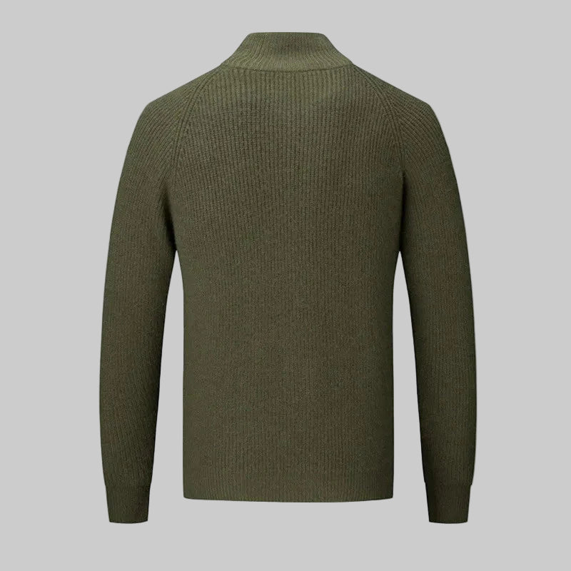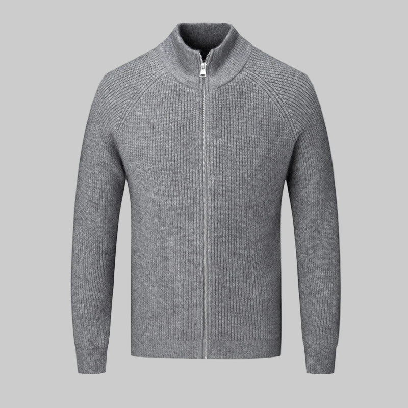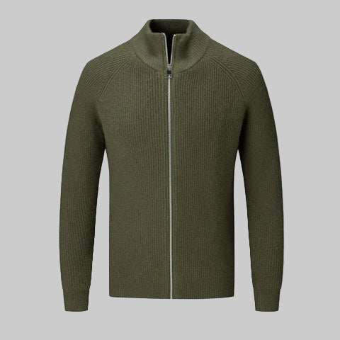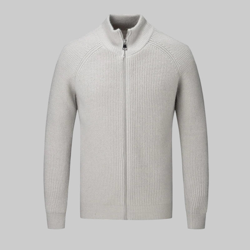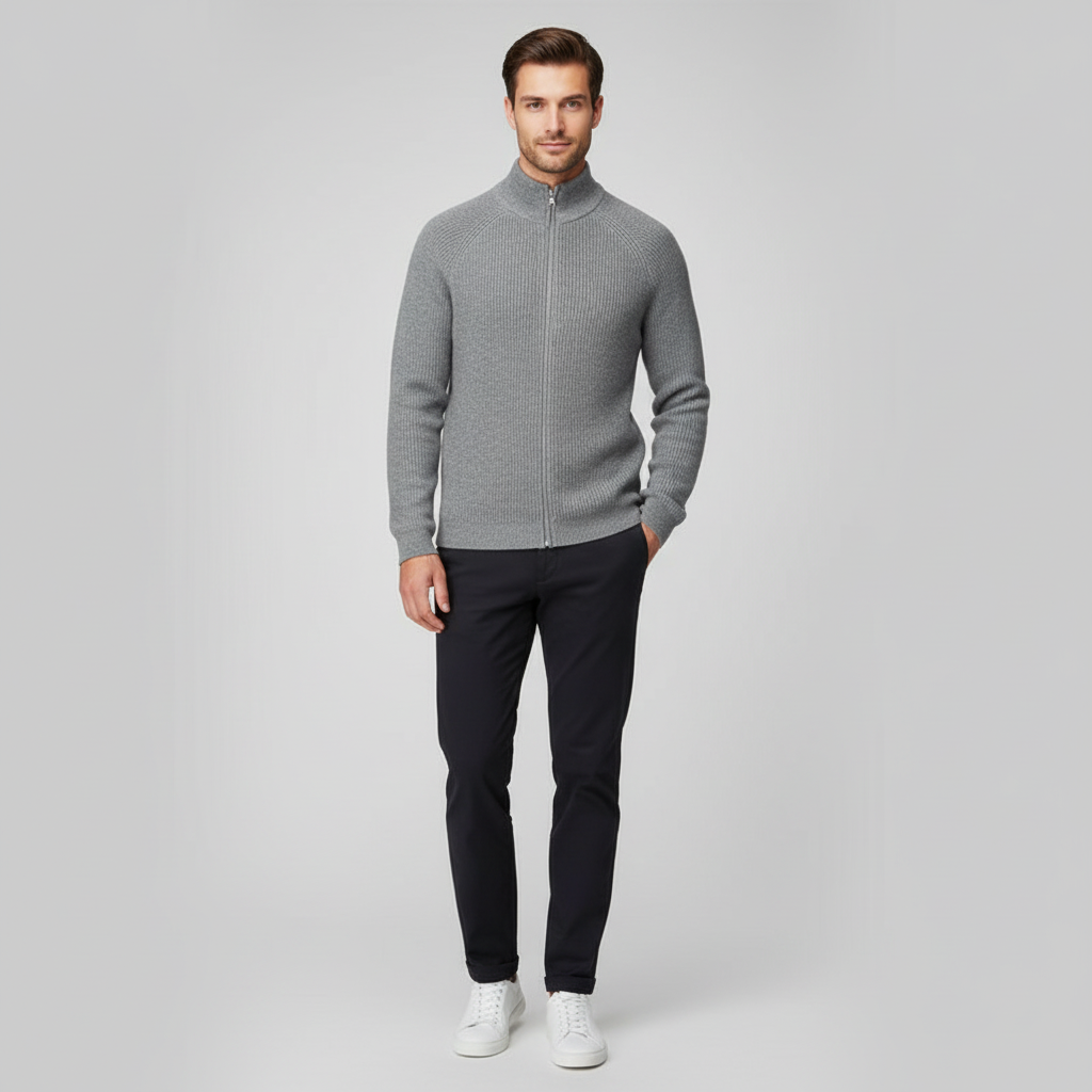 Der hohe Stehkragen mit durchgehendem Reißverschluss sorgt für vielseitige Stylingmöglichkeiten – von sportlich bis elegant. Die klare, strukturierte Rippoptik verleiht der Jacke einen edlen, maskulinen Look und macht sie zum idealen Begleiter für Alltag, Büro oder Wochenenden im Freien.