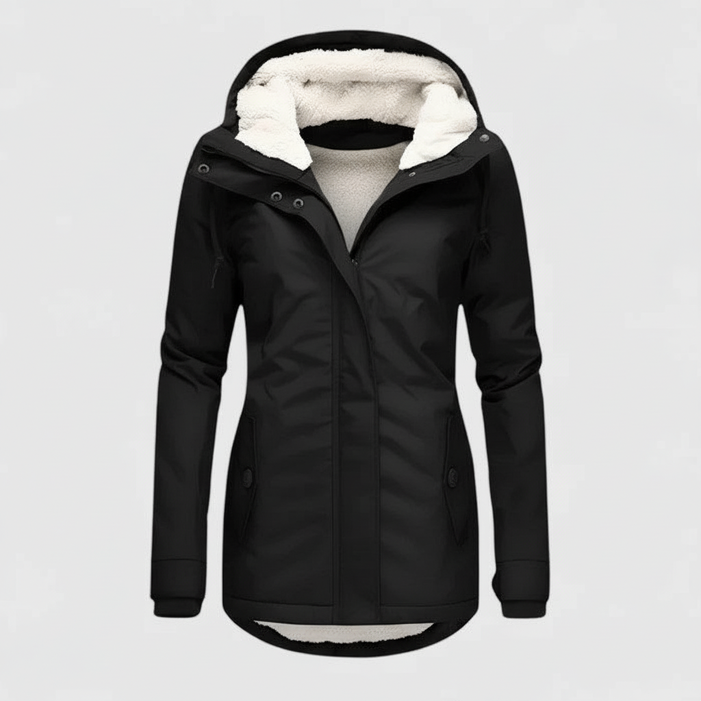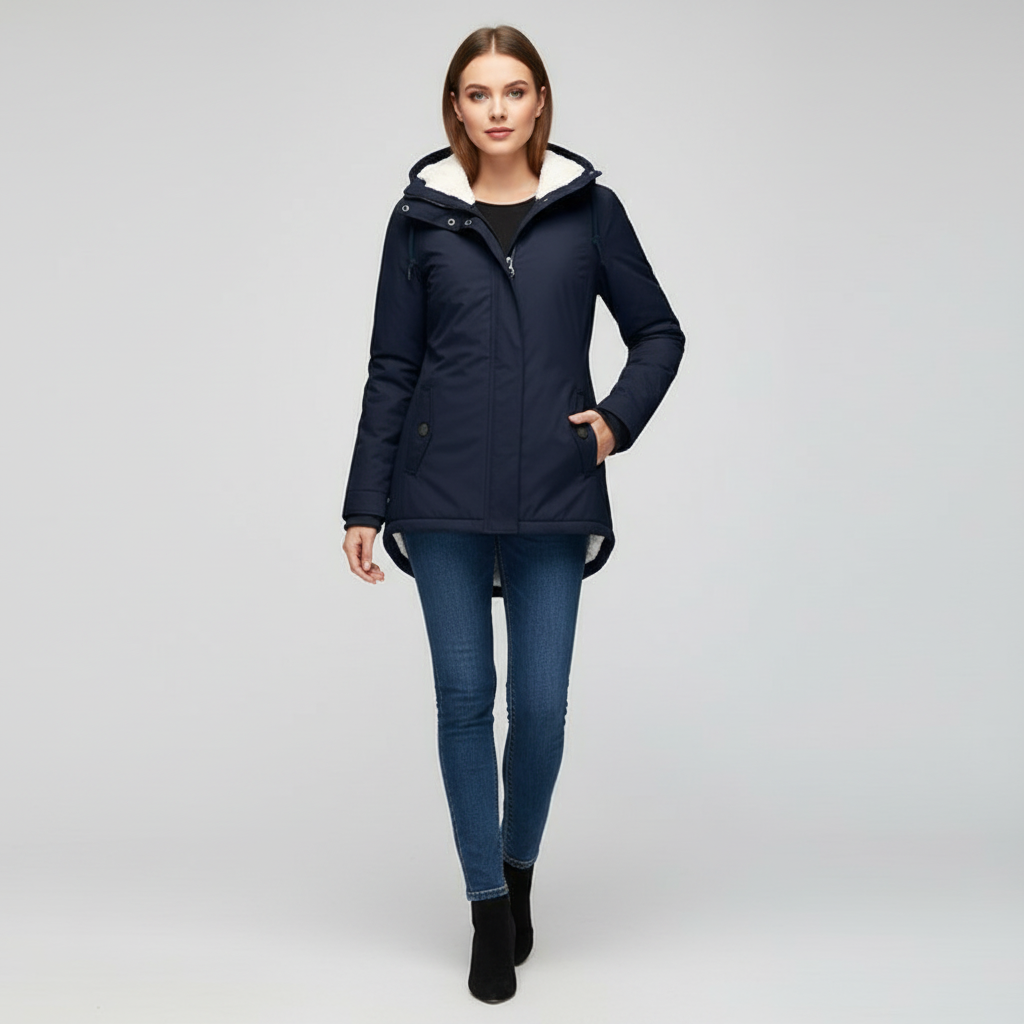Der figurbetonte Schnitt sorgt für eine schmeichelhafte Silhouette, ohne die Bewegungsfreiheit einzuschränken. Die große Kapuze mit Fleecebesatz bietet zusätzlichen Schutz und Wohlfühlkomfort. Ideal für den Alltag, Spaziergänge und kalte Wintertage.